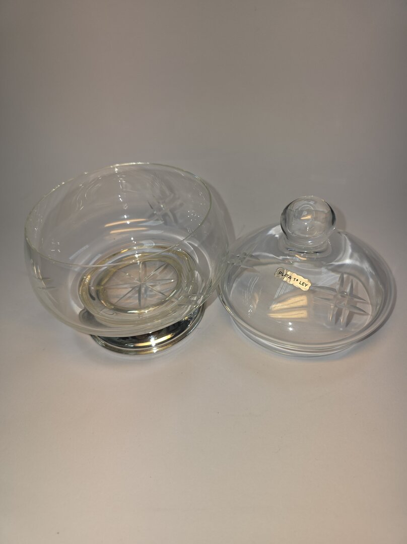 bombonera de cristal tallado con base de plata medidas 15 cm.por 13cm.